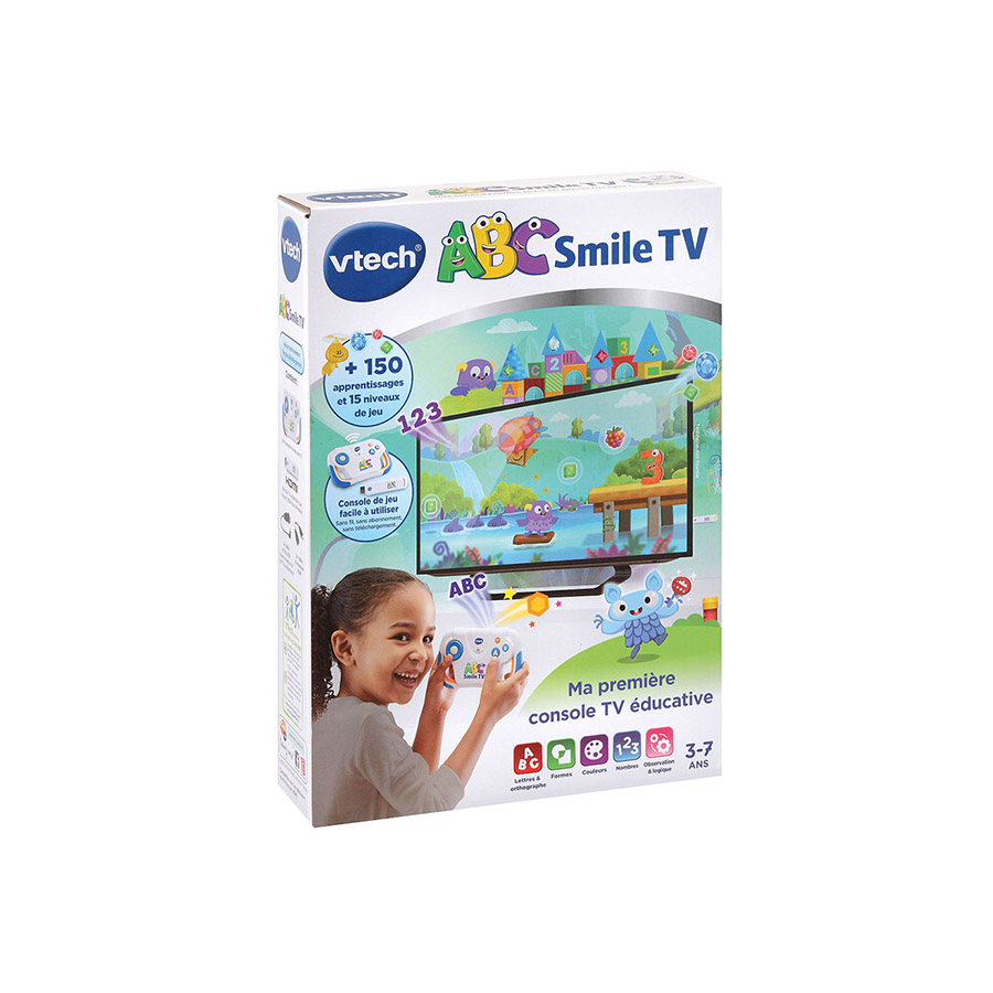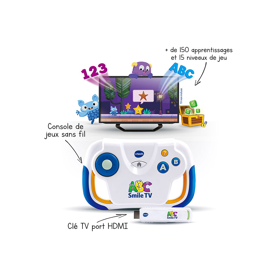 ABC Smile TV, la console facile à utiliser, adaptée à vos petits enfants. Pour jouer avec la console ABC Smile TV de VTech, il suffit de connecter la clé HDMI à une télévision ! Nul besoin d’acheter des jeux additionnels, tout le contenu est embarqué dans la console.