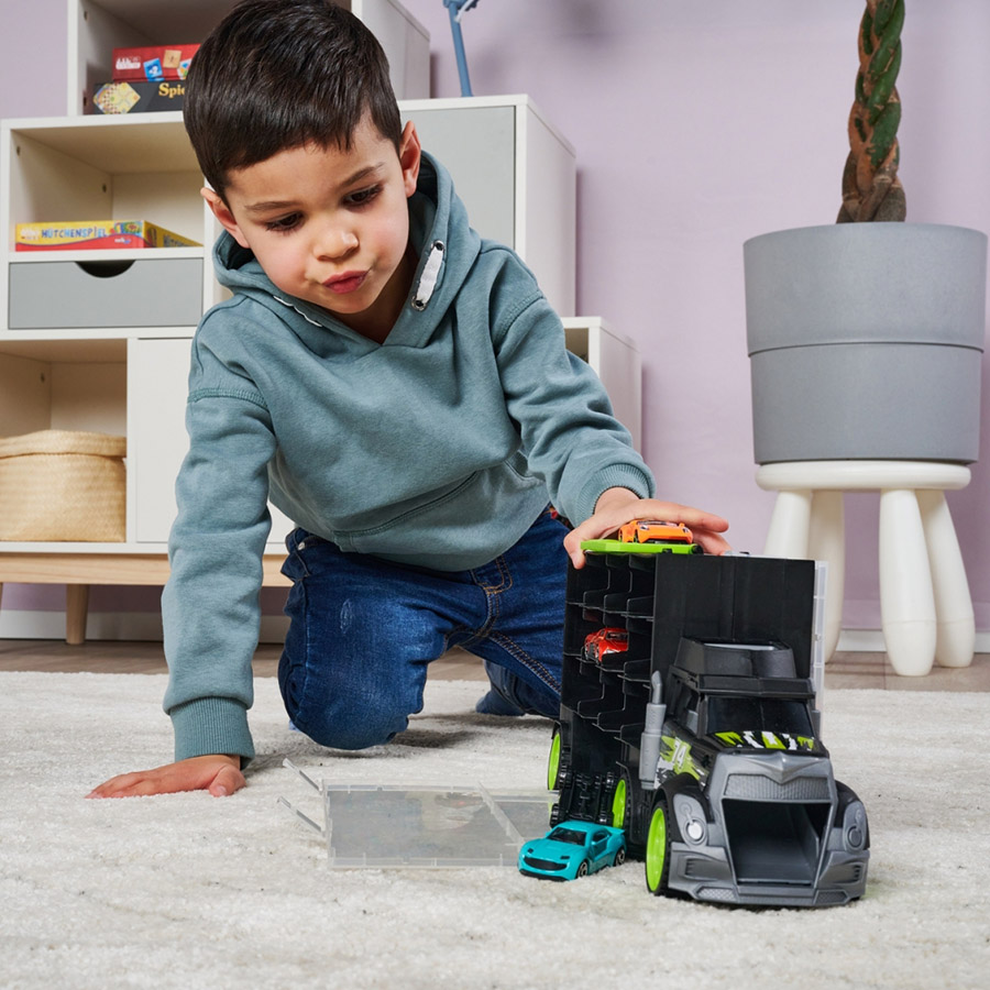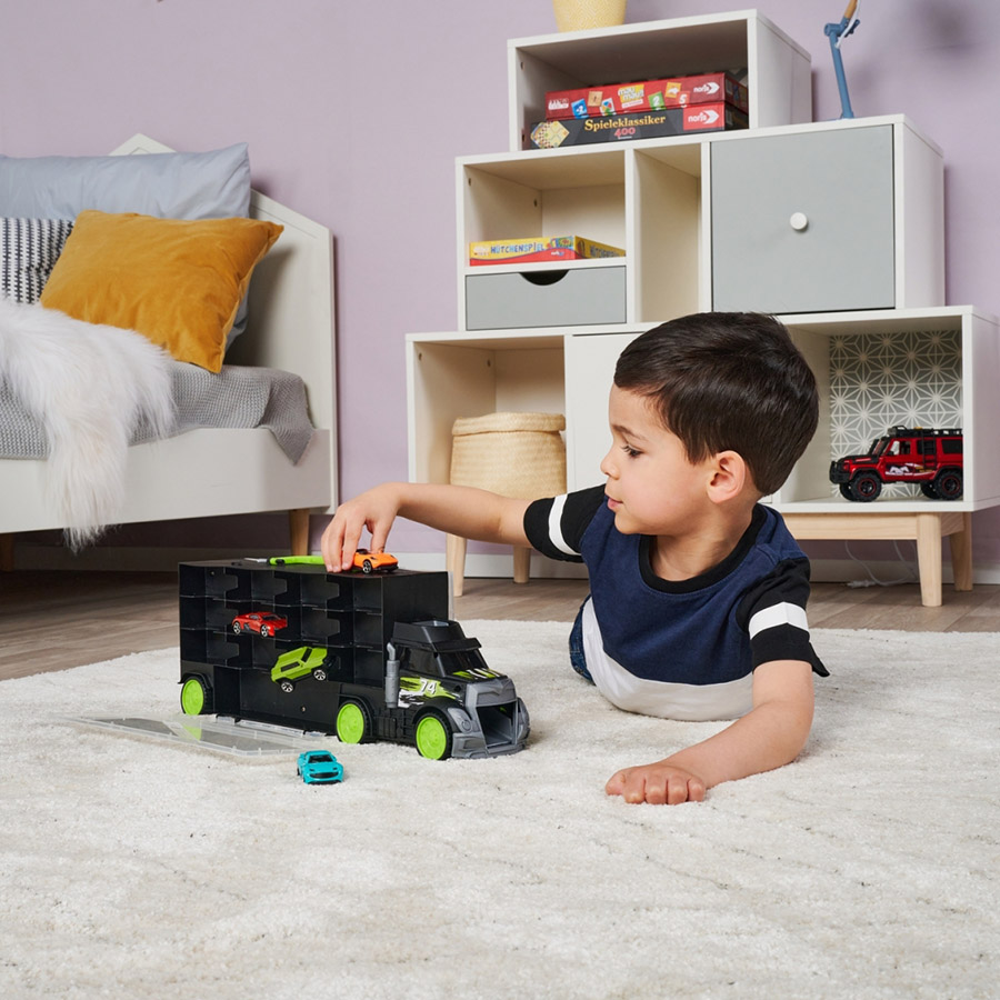 Le Dickie Toys Small Truck Carry Case est un camion-jouet de 62 cm à roues libres, idéal pour les enfants dès 3 ans. Il peut contenir jusqu’à 28 petites voitures, dont 4 voitures incluses, des accessoires et une rampe. Parfait pour organiser et transporter les véhicules, ce camion offre des heures de jeu imaginatif.