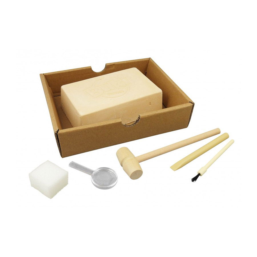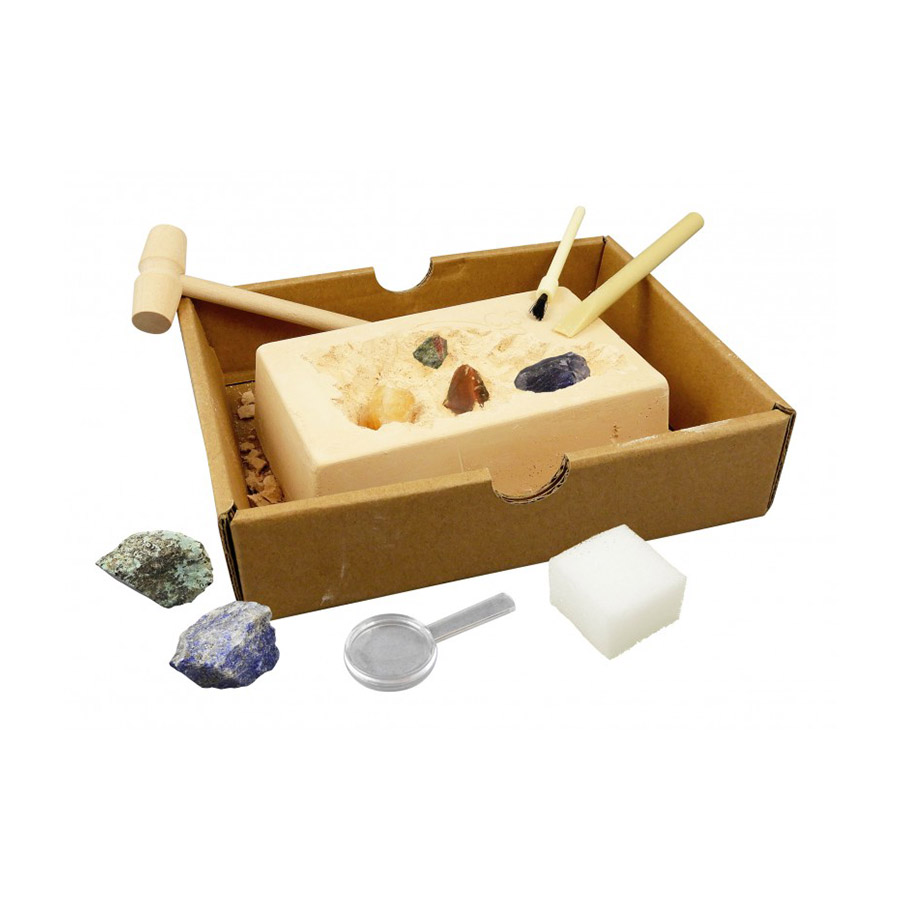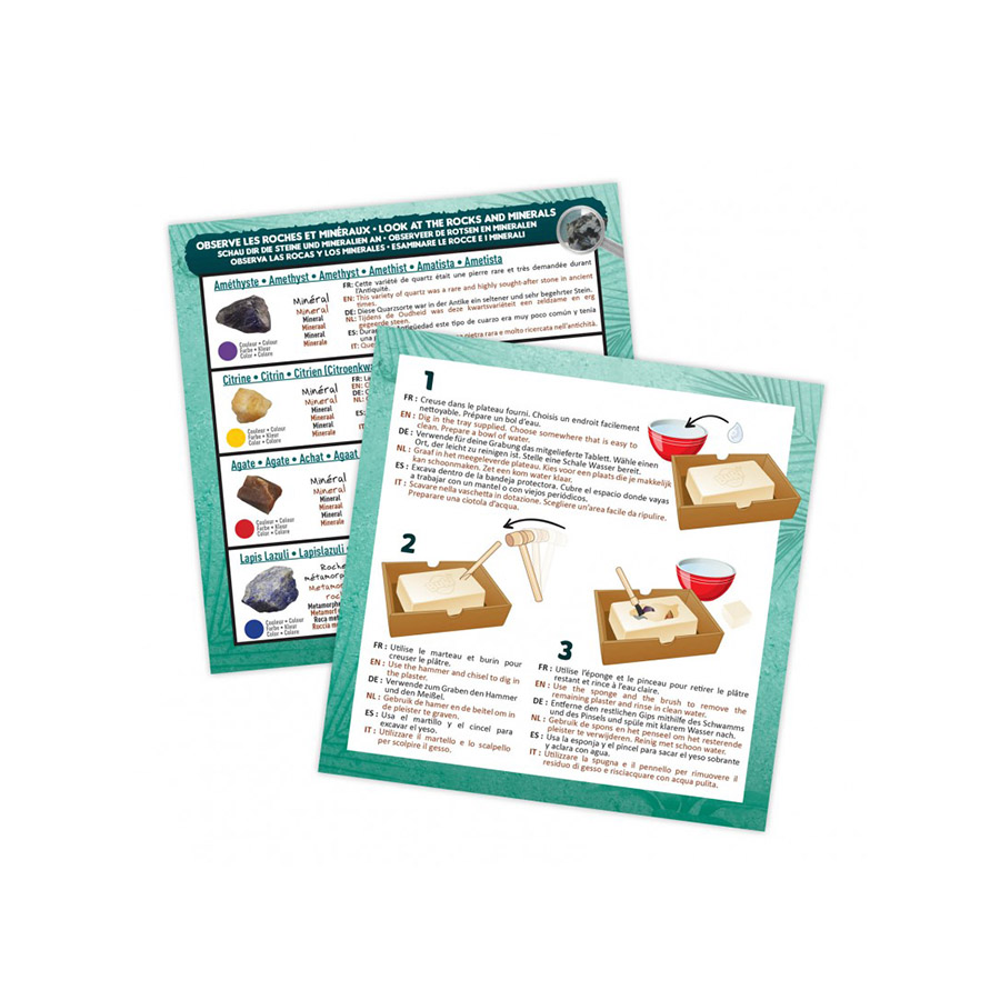 L’enfant gratte, creuse et brosse le bloc pour faire apparaître les minéraux cachés. Il peut ensuite les identifier grâce à la fiche incluse.