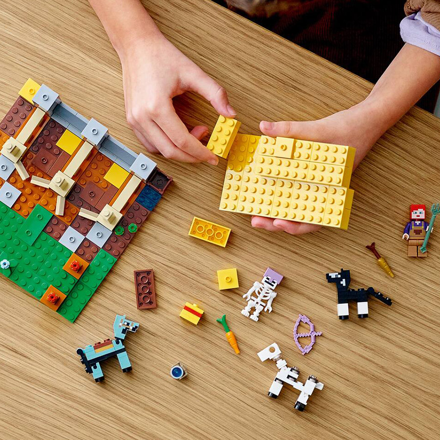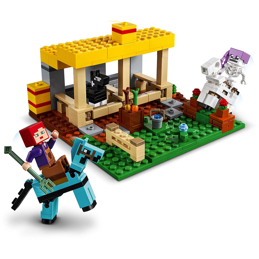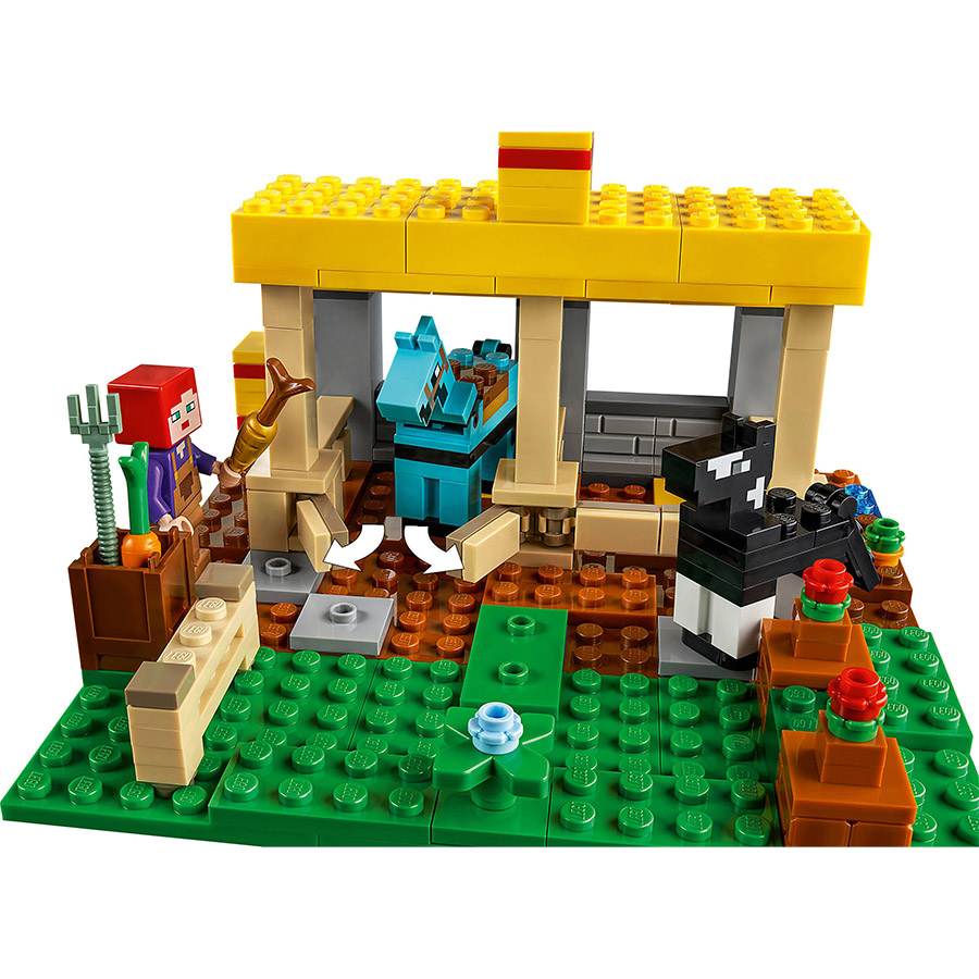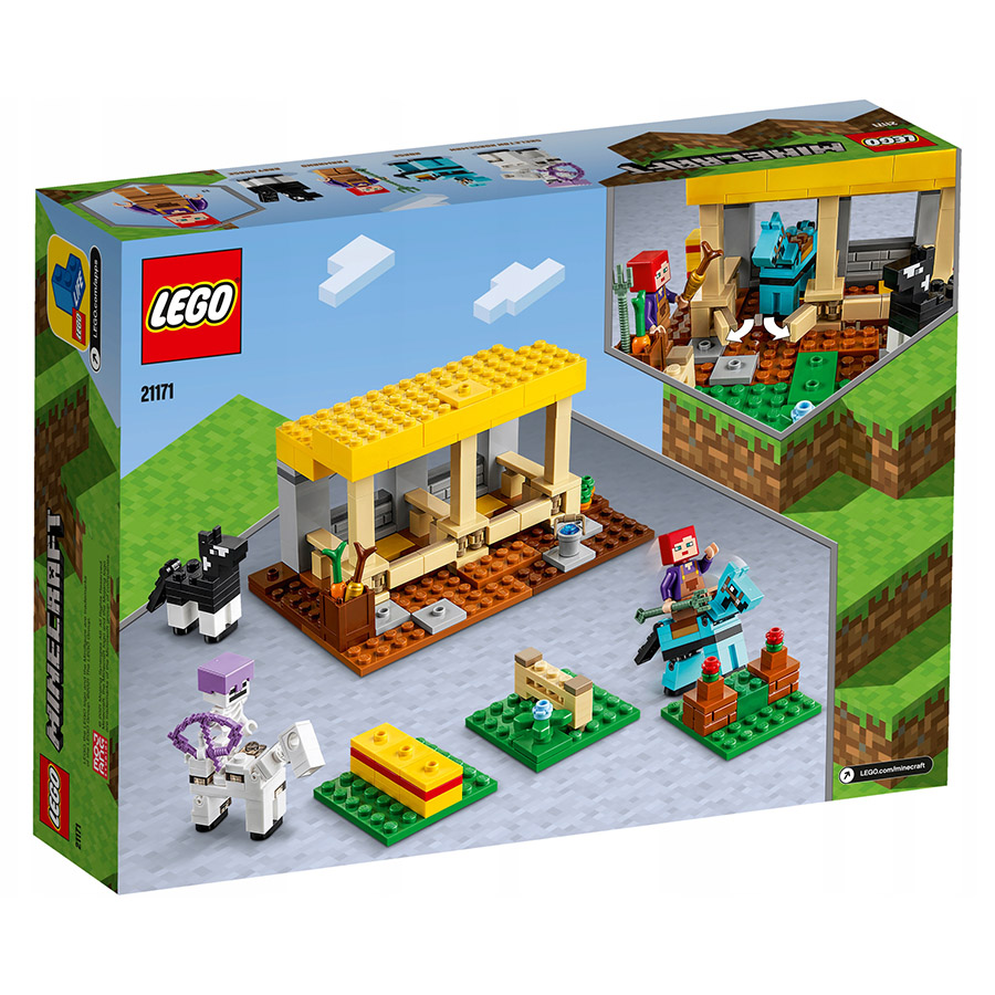 Écurie LEGO® Minecraft™ 21171 : Plongez dans l’univers de Minecraft avec cette écurie détaillée. Le set comprend une structure avec un toit amovible, des enclos pour les chevaux, une échelle, une table de travail et des accessoires tels qu’un seau, une carotte dorée et une armure en diamant. Les figurines incluses sont Steve, un cheval, un poulain et un squelette. Idéal pour les enfants dès 8 ans.