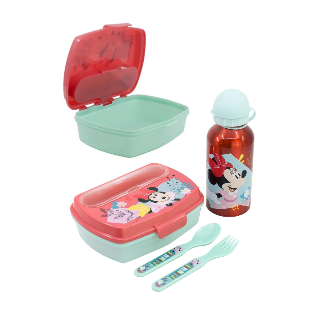 Ensemble Lunch Box Minnie Mouse : boîte à lunch, gourde et couverts assortis, décorés aux couleurs de Minnie Mouse. Parfait pour les enfants dès 3 ans, cet ensemble rend l’heure du repas plus amusante et encourage l’autonomie.