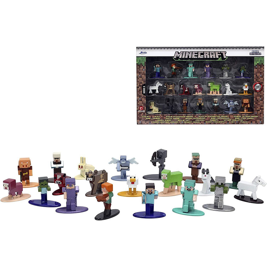 Recréez vos propres aventures de l’univers Minecraft avec ce pack de 20 figurines métalliques en taille Nano de 4cm contenant tous vos personnages préférés du célèbre jeu vidéo : Steve, Alex, Steve in Diamond Armor, Alex in enchanted Armor, Zombie in Iron Armor, Baby Zombie, White Horse, Brown Mooshroom, Baby Mooshroom, Baby Pink Sheep, Green Sheep, Jellie Oat, Chiken, Rabbit, Wither Skeleton, Shamp Leather Worker, Desert Mason, Snowy Toolsmith, Vex et Piglin.