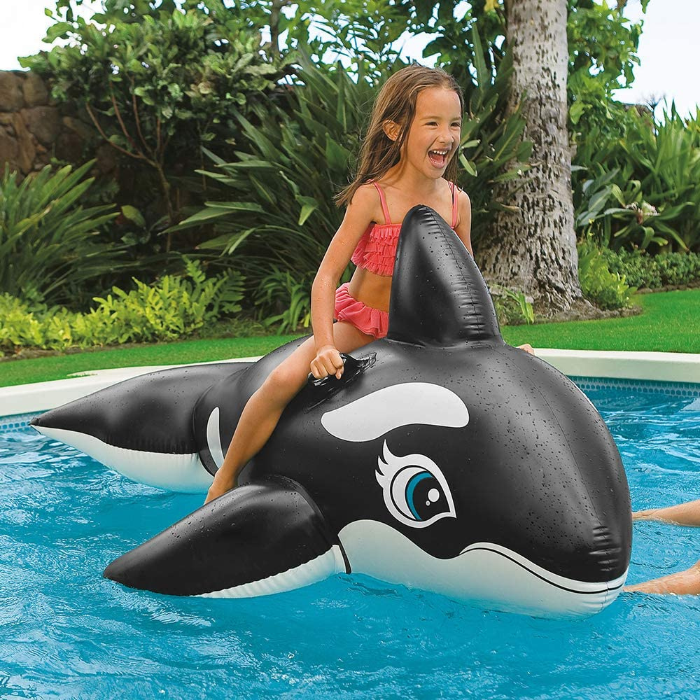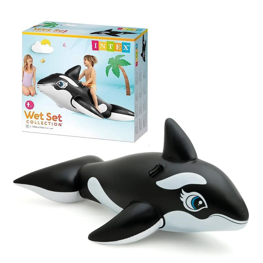 Grande Baleine Gonflable INTEX : matelas à chevaucher réaliste, 193 × 119 cm, avec 2 poignées et 2 chambres à air. Convient aux enfants dès 3 ans, jusqu’à 40 kg. Idéal pour des moments de baignade ludiques et sécurisés.