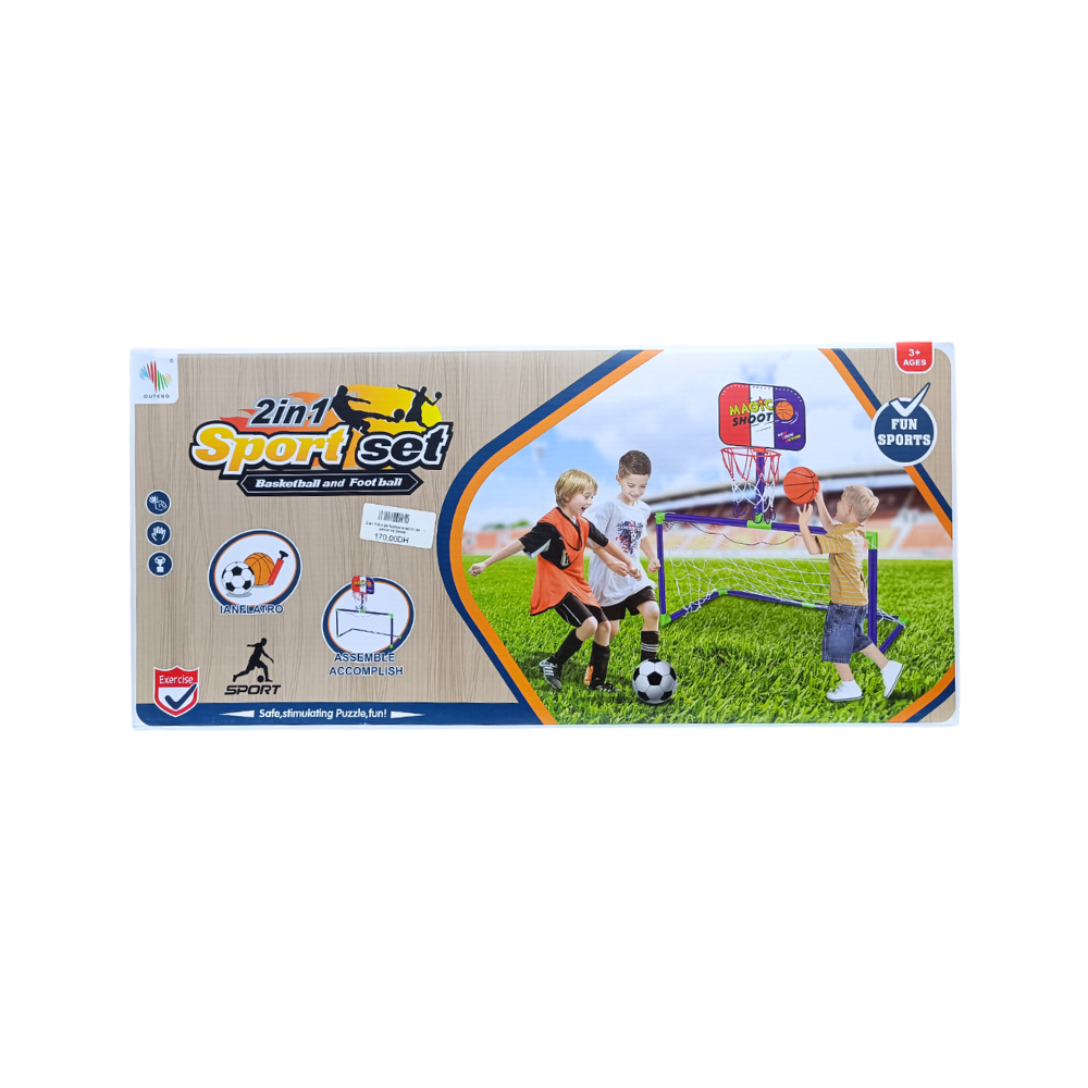 Un ensemble 2 en 1 combinant un but de football et un panier de basket avec ballons inclus, conçu en plastique robuste et stable. Idéal dès 2 à 3 ans pour développer coordination et plaisir de jouer à plusieurs sports.