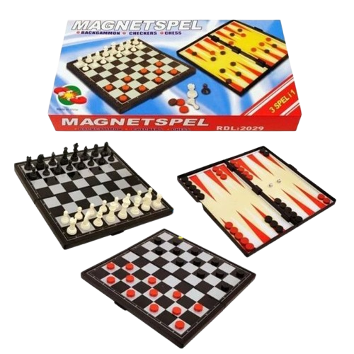 Le Jeux d’Échecs Magnétique 2×1 offre deux jeux classiques dans un seul coffret compact : les échecs et les dames. Grâce à ses pièces magnétiques, il est idéal pour jouer partout, sans perdre ses pions !