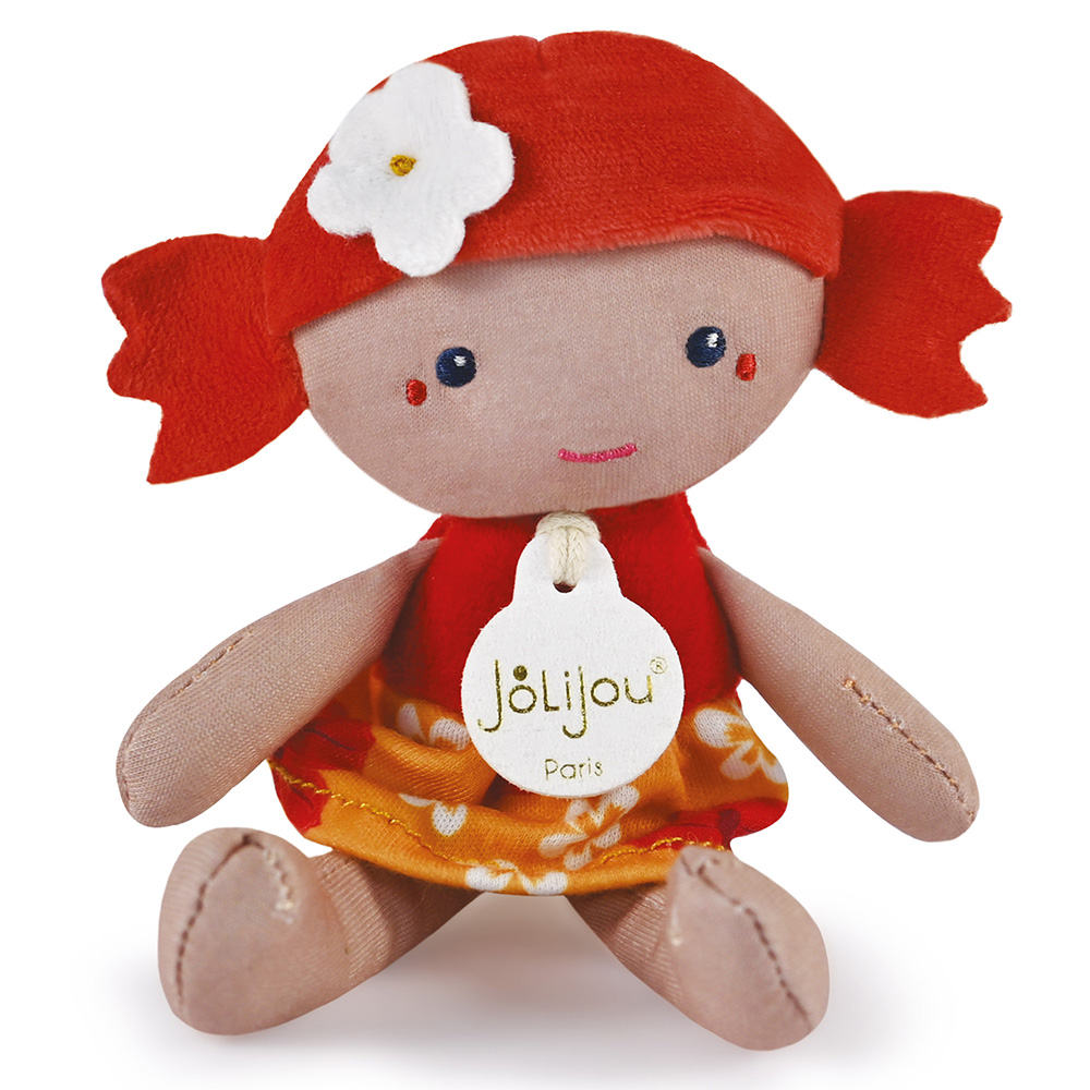 Petit poupon souple de 16 cm, habillé d’une jolie robe rouge orangée ornée d’imprimés fleurs hawaïennes, avec une délicate paquerette dans les cheveux.