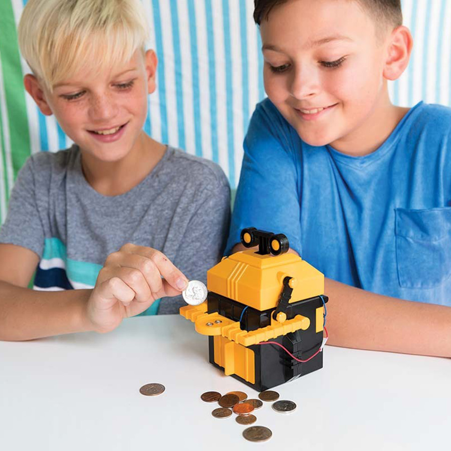 Le KidzRobotix Money Bank Robot de 4M est un kit éducatif innovant qui permet aux enfants de construire leur propre robot « économe ». En plaçant une pièce sur son bras, le robot la « avale », rendant l’épargne ludique et interactive. Ce jouet stimule la créativité, la compréhension des circuits électriques de base et l’intérêt pour la robotique.