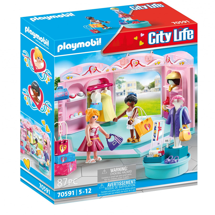 Le set de jeu contient 87 pièces : 1 boutique de mode, 2 personnages Playmobil, des vêtements, des sacs et d’autres accessoires.