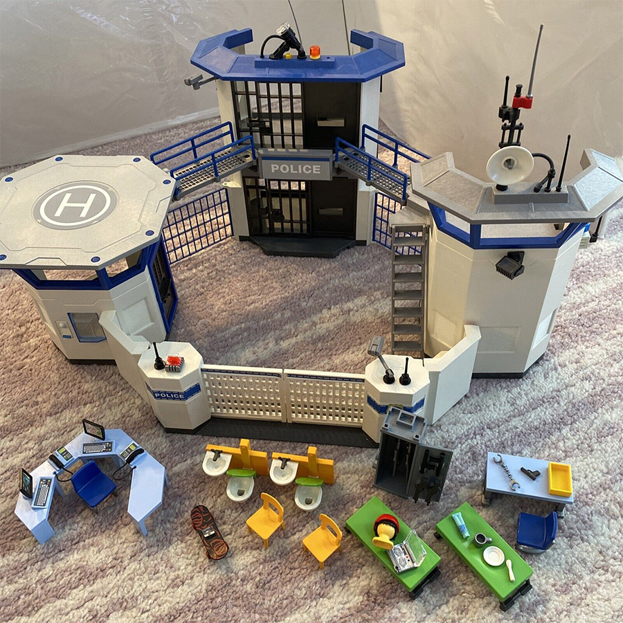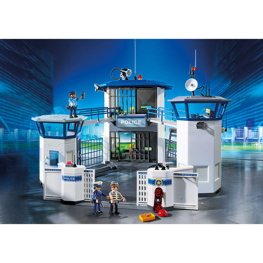 Comprend trois personnages, une hélisurface pour l’hélicoptère réf. 6921 et un mur cassable pour l’évasion. La voiture de policiers avec gyrophare et sirène réf. 6920 peut se garer dans la cour du commissariat. Le portail s’ouvre en coulissant. Avec de nombreux espaces de jeux. Possibilité de jouer de tous les côtés. Alerte ! Le prisonnier tente de s’évader ! Le commissariat de police comprend deux cellules et la tour permet de contrôler le bâtiment, mais le prisonnier parvient à s’échapper grâce au mur cassable ! Pas de panique, les policiers peuvent le retrouver avec la boîte de prise d’empreintes digitales. Comprend trois personnages, une hélisurface pour l’hélicoptère réf. 6921 et un mur cassable pour l’évasion. La voiture de policiers avec gyrophare et sirène réf. 6920 peut se garer dans la cour du commissariat.