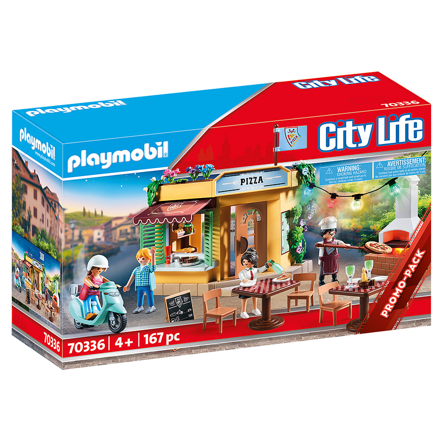 Playmobil 70336 – Pizzeria avec terrasse : Offrez à vos enfants une expérience culinaire immersive avec ce set de 167 pièces. Il comprend une pizzeria colorée avec une terrasse animée, équipée d’un four à pizza en pierre, de tables, de chaises et de lanternes suspendues qui s’illuminent (nécessite 3 piles AAA non incluses). Les figurines incluses sont un pizzaiolo, une serveuse, un client et un livreur à scooter, permettant de recréer des scènes de la vie quotidienne. Ce set favorise le jeu imaginatif et est recommandé pour les enfants à partir de 4 ans.
