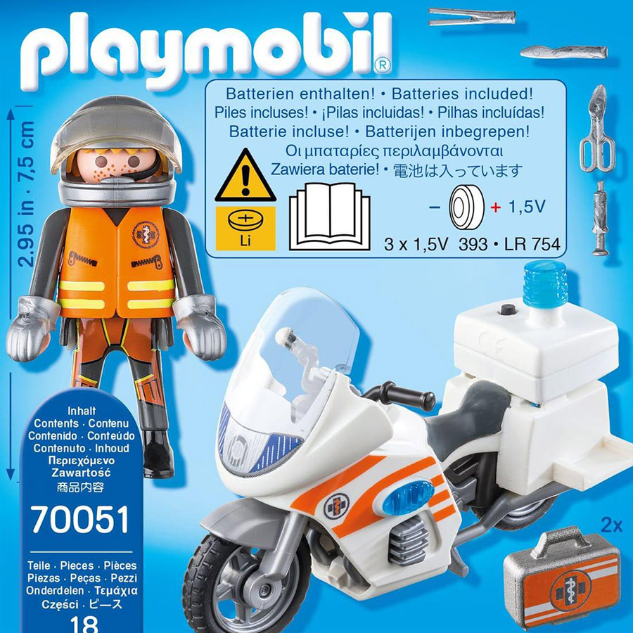 Ce secouriste Playmobil à bord de sa moto est toujours prêt à porter secours à des personnages dans le besoin. Il ne se déplace jamais sans sa mallette et le matériel médical nécessaire en cas de besoin. Vite une personne a fait une chute ! A l’aide de son véhicule il fonce à toute allure. Gyrophare allumé, les autres véhicules se poussent sur son chemin.