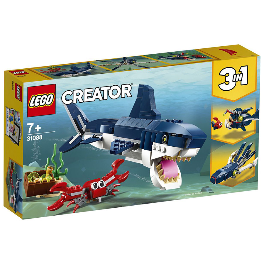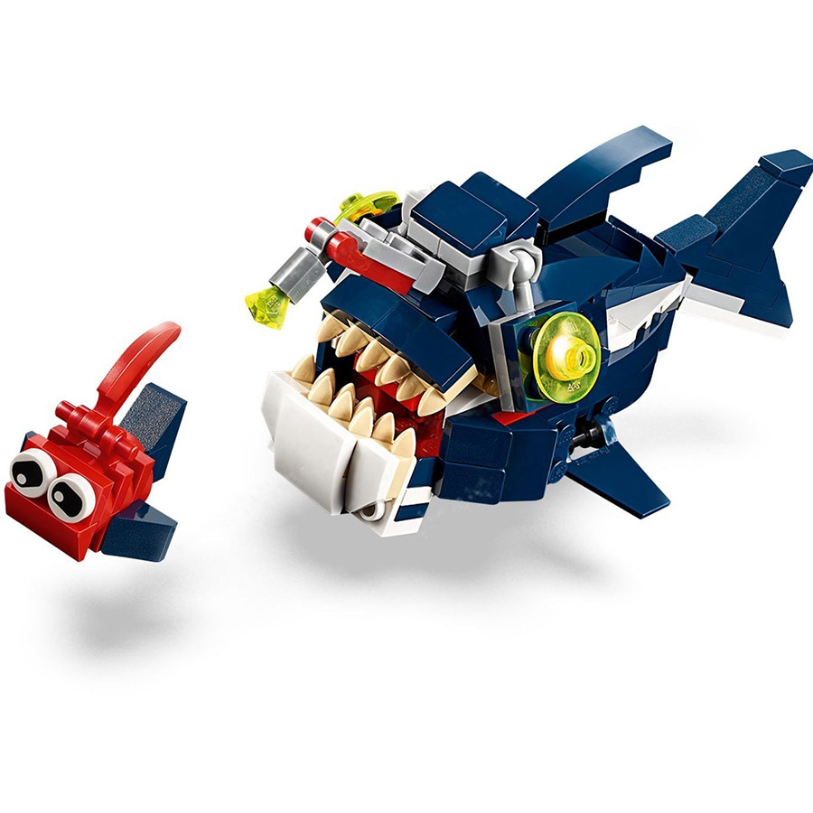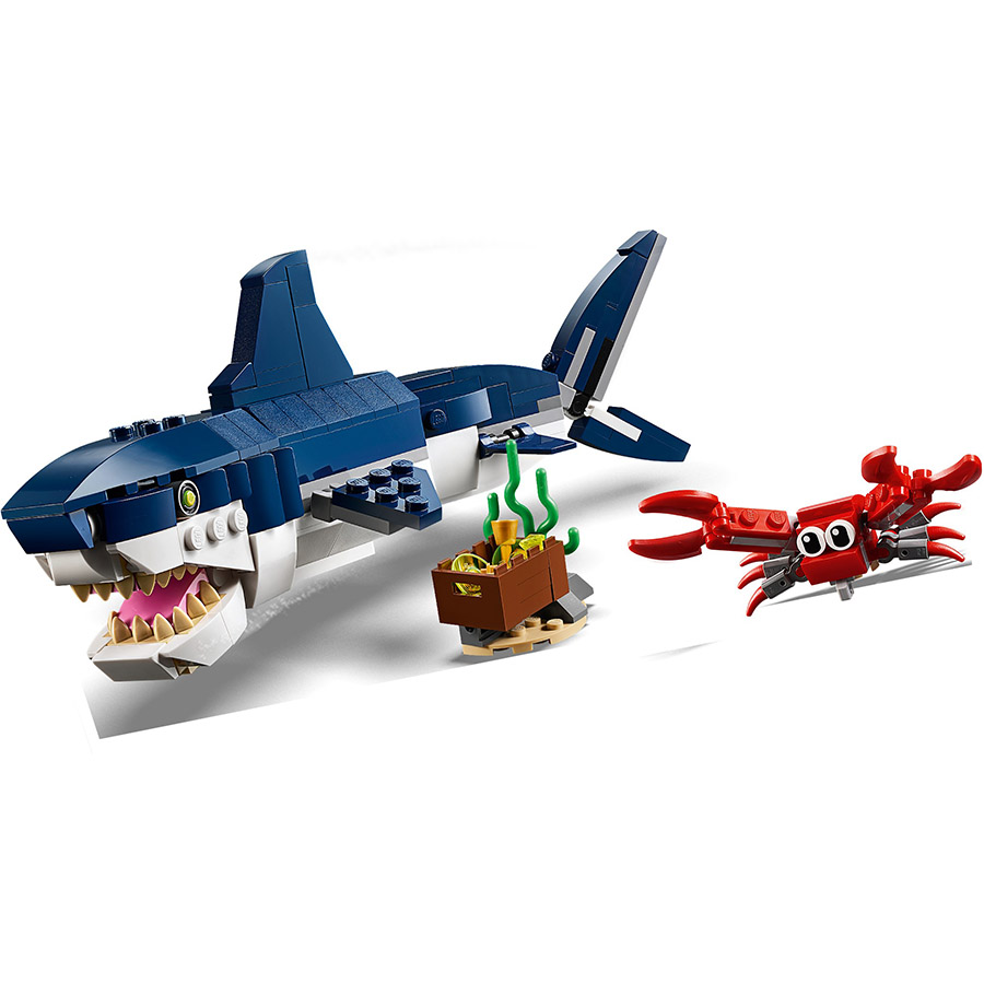 Aidez le joli crabe de mer à protéger la boîte au trésor contre l’énorme LEGO requin avec ses mâchoires mordantes, ses dents pointues, ses yeux réfléchissants et sa puissante queue sifflante ! Puis reconstruisez un calamar ou une baudroie avec une bouche géante pour davantage de plaisir sous l’eau.