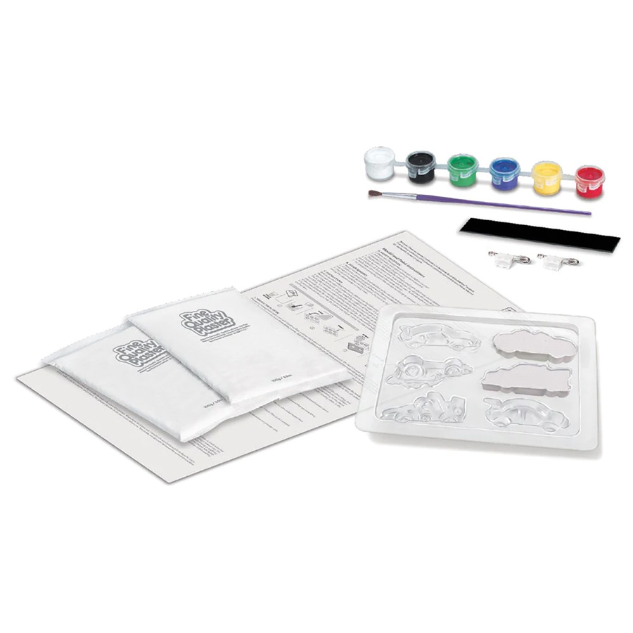 Comprend un moule avec 6 motifs assortis, du plâtre, des aimants, des broches, des peintures et un pinceau