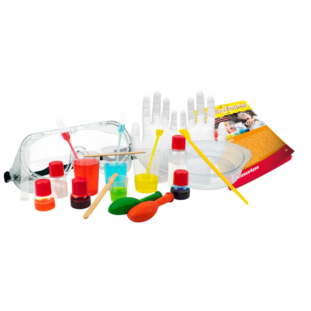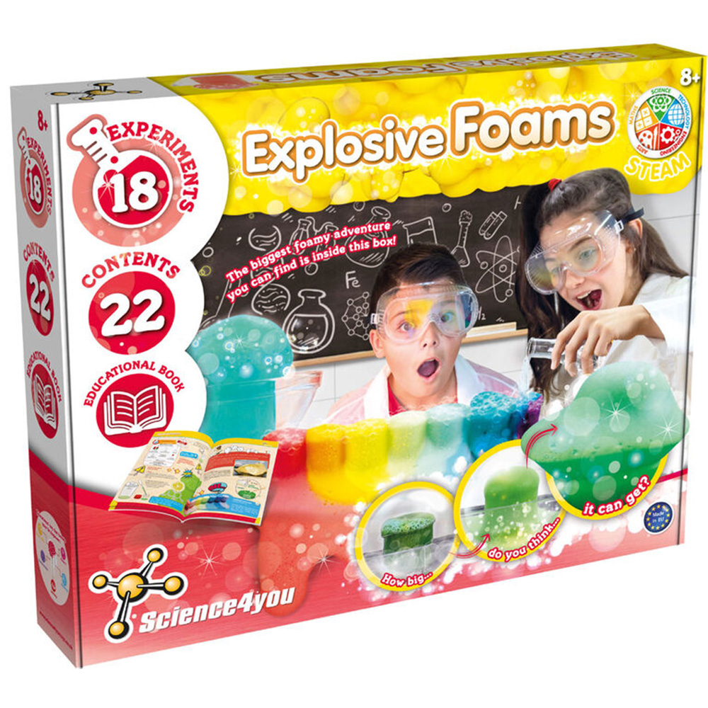 Découvre comment: Utiliser du citron ou du vinaigre pour faire des explosions, faire une course de mousses de couleurs, préparer des mousses de différentes textures, et plusieurs autres expériences… Contenu du kit: Livret éducatif de 36 pages, Lunettes de protection, Tube à essai, Grands verres à mesurer, Petit verre à mesurer, Spatules en bois, Spatule en plastique, Pipettes Pasteur, Bicarbonate de sodium, Acide citrique, Colorant rouge, Colorant bleu, Colorant jaune, Ballons, Gants et Bol. Science4you est plus qu’une expérience scientifique, c’est une expérience éducative. Nous nous efforçons de trouver l’équilibre entre l’éducation et le plaisir. Regardez les yeux de votre enfant s’illuminer lorsqu’il complète ses expériences qui les aident à développer un amour pour la science. Chaque ensemble vient avec un livret écrit par de vrais scientifiques afin d’éduquer vos enfants sur les bases de la science, de l’histoire, ainsi que sur des informations générales à propos de ses expériences. Les ensembles Science4you sont faits au Portugal et testés selon de stricts standards européens. Il a été prouvé que les ensemble Science4you améliorent les capacités cérébrales du cerveau de votre enfant! Motricité, Sociabilité, Apprentissage, Concentration et Créativité.