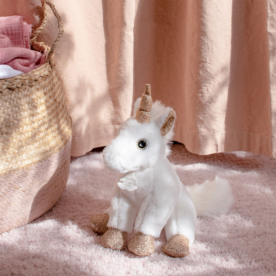 Cette peluche Licorne Blanc Or de 23 cm est le cadeau idéal pour les enfants dès 24 mois. Douce, sécuritaire et féerique, elle apportera tendresse et magie à votre enfant. Son pelage blanc éclatant, sa corne dorée et ses sabots pailletés en font un compagnon enchanteur. Facile à entretenir, elle assure une hygiène optimale pour le bien-être des tout-petits.