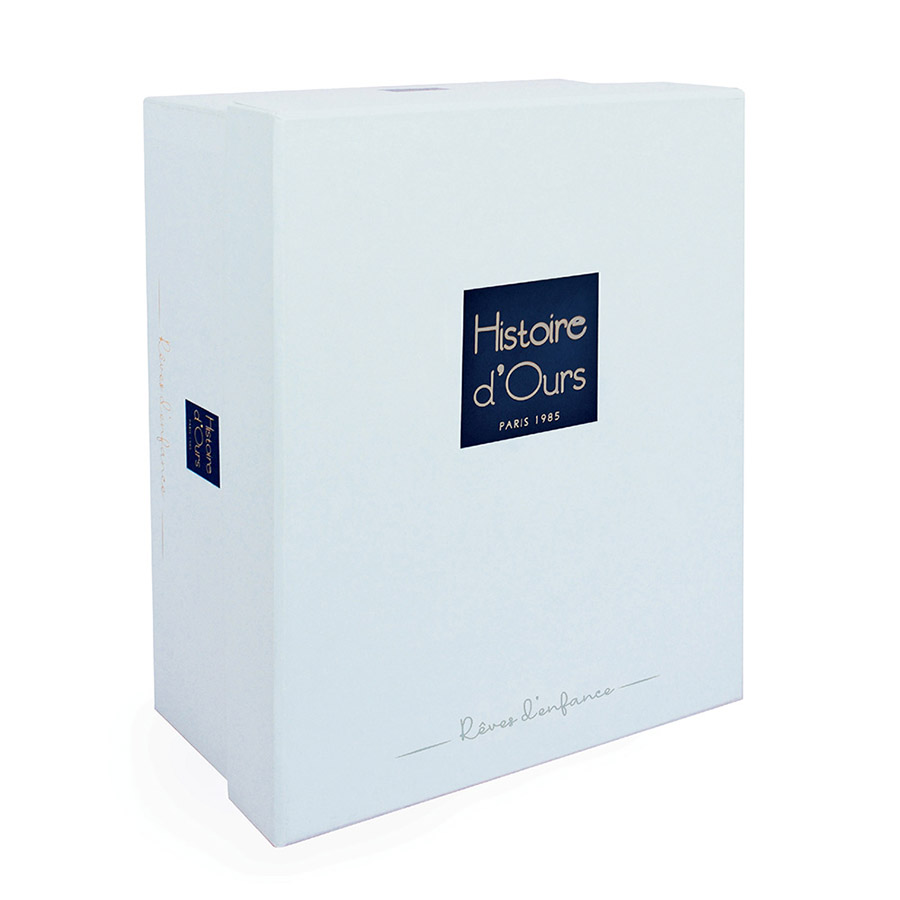Une belle Peluche PREPPY CHIC Ours ivoire particulièrement très chic avec son petit nœud papillon et ses accessoires en joli tissu bleu marine finement rayé par un fil argent. Un joli pantin souple et très doux pour petits et grands, que chacun appréciera pour jouer, cajoler ou décorer la chambre. Présenté dans une belle boîte, c’est un cadeau idéal dès la naissance.