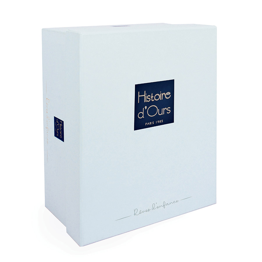Une belle Peluche PREPPY CHIC, Ours ivoire particulièrement très chic avec son petit nœud papillon et ses accessoires en joli tissu bleu marine finement rayé par un fil argent. Un joli pantin souple et très doux pour petits et grands, que chacun appréciera pour jouer, cajoler ou décorer la chambre. Présenté dans une belle boîte, c’est un cadeau idéal dès la naissance.