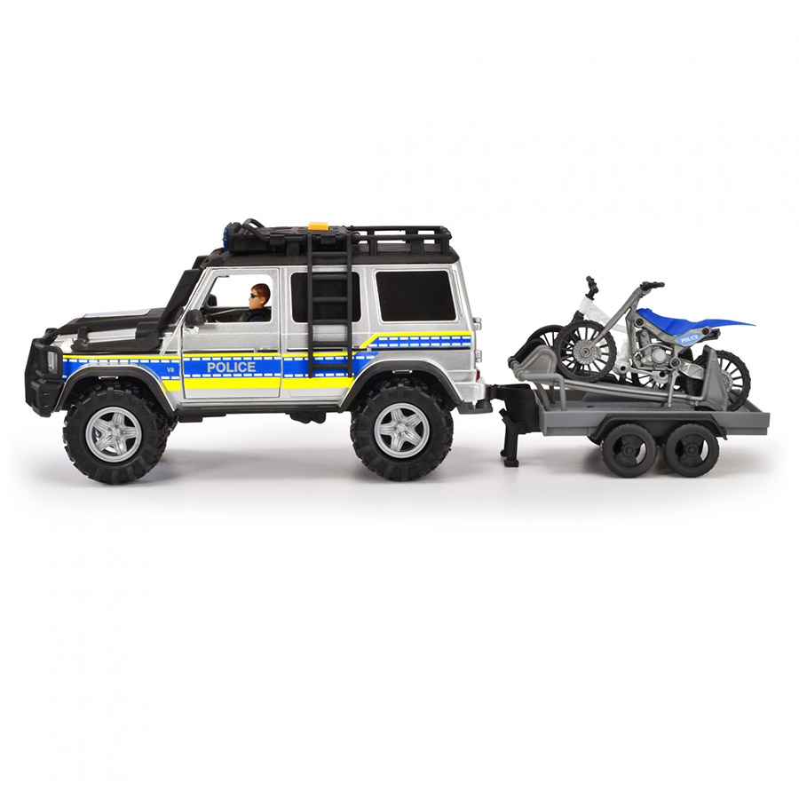Dickie Toys – PlayLife Mercedes Police Set – est un SUV de police Mercedes-Benz G 500 muni d’une remorque, d’une moto, d’un vélo électrique et d’une figurine.
