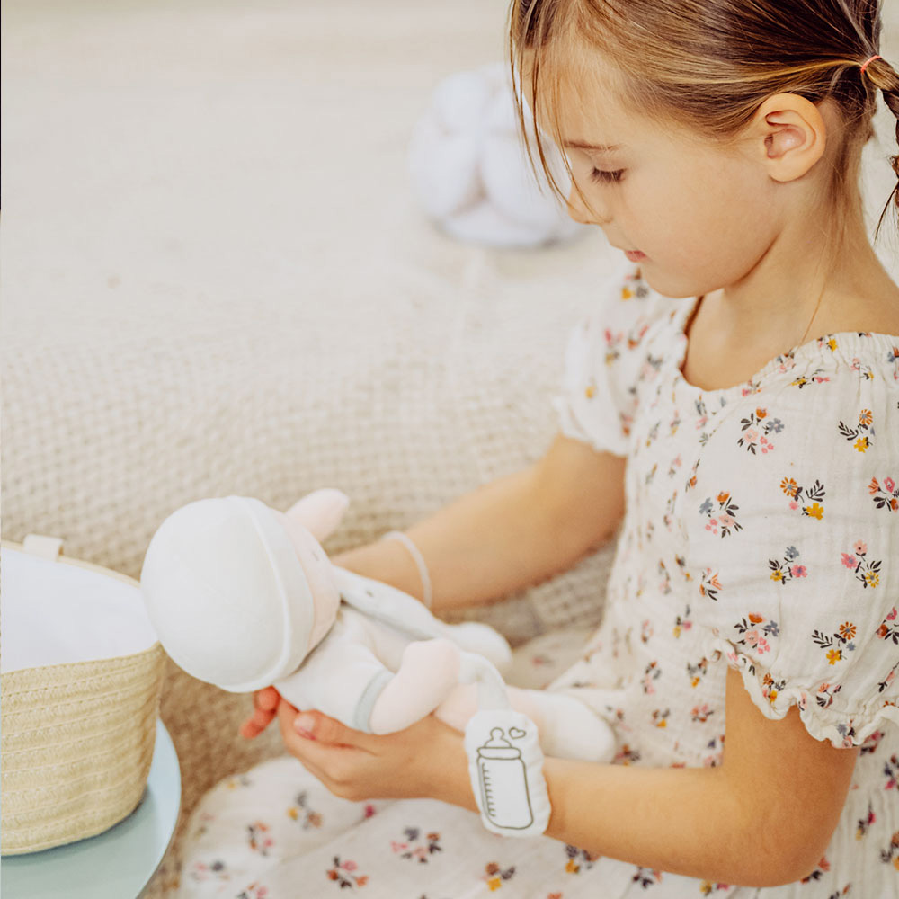 En balade avec mon poupon Couffin Pol ! Tout doux, tout souple habillé d’une d’un body blanc et gris et d’un petit bonnet, il tient au bout de sa main, un petit biberon. Formidable compagnon de jeu pour tous les petits, à transporter au parc, en voyage ou chez des amis. Il promet de nombreuses heures de jeu d’imitation !