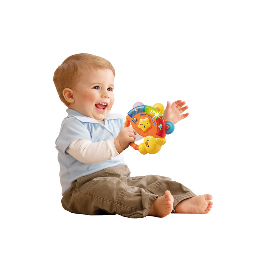 Succombez pour ce petit hochet musical en forme de tambourin avec son oiseau musicien “P’tit Tambourin” de la marque Vtech.