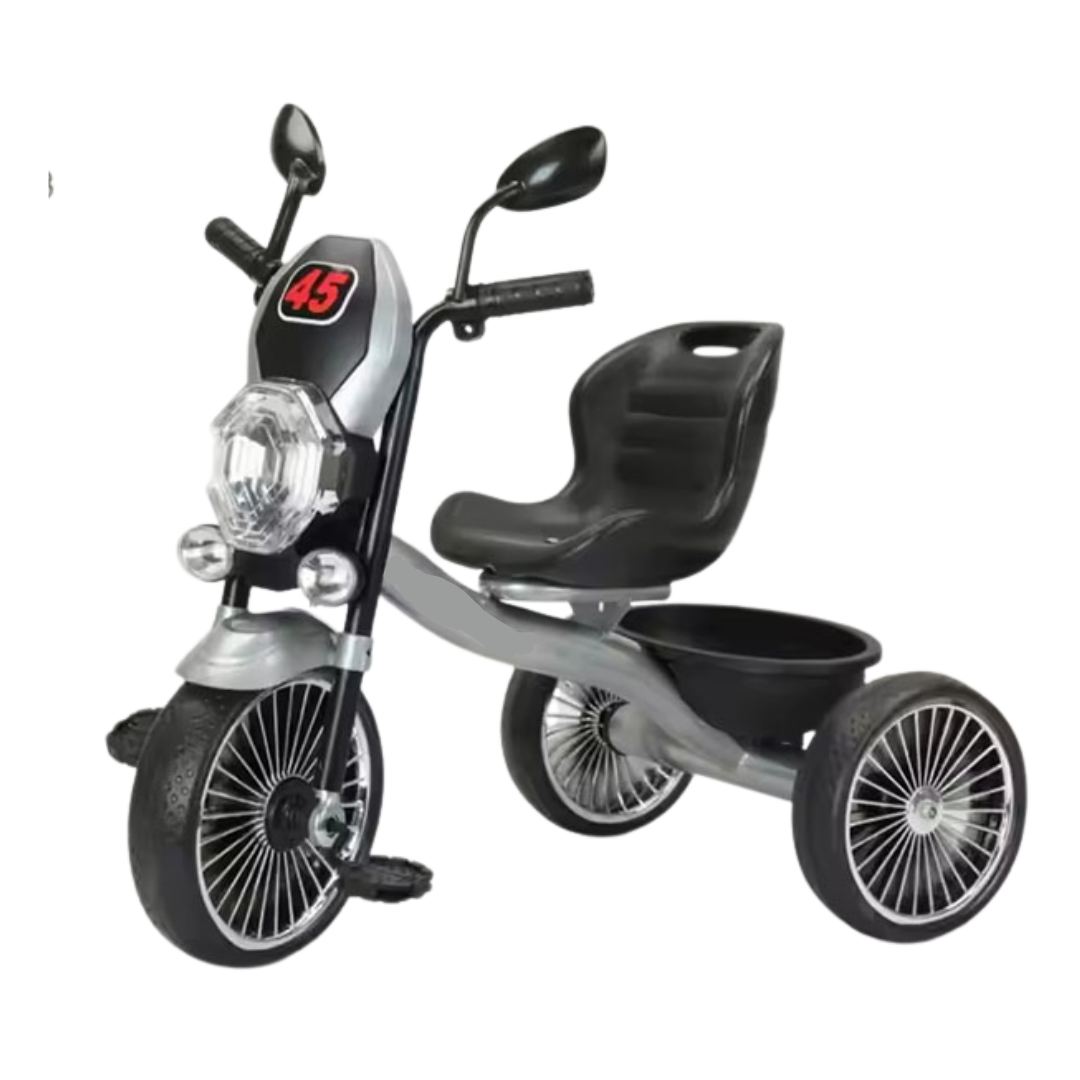 Tricycle sport gris, stable et confortable, conçu pour accompagner les enfants dès 2 ans dans leurs premières découvertes à vélo, avec accessoires ludiques pour un jeu sûr et fun.