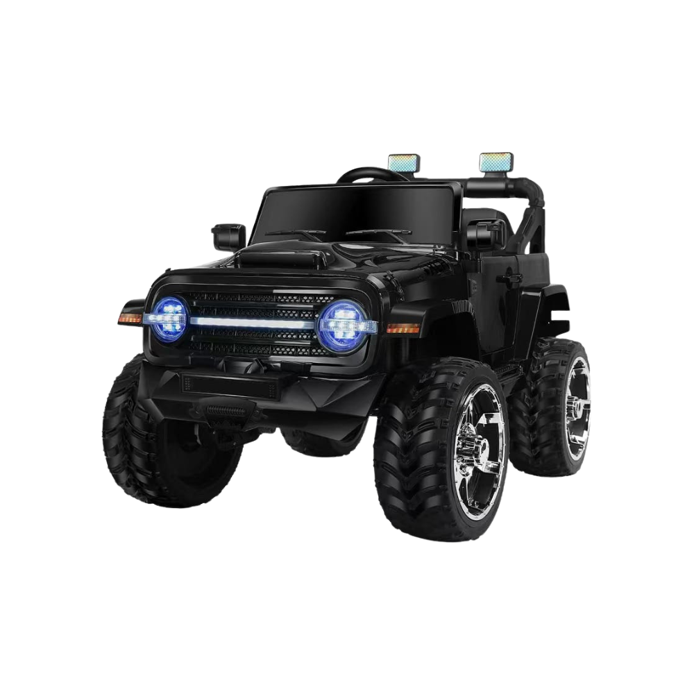 Voiture 4×4 électrique 12V Noire, équipée de phares LED, tableau de bord interactif et télécommande parentale. Parfaite pour les enfants dès 3 ans, offrant une conduite réaliste et sécurisée.