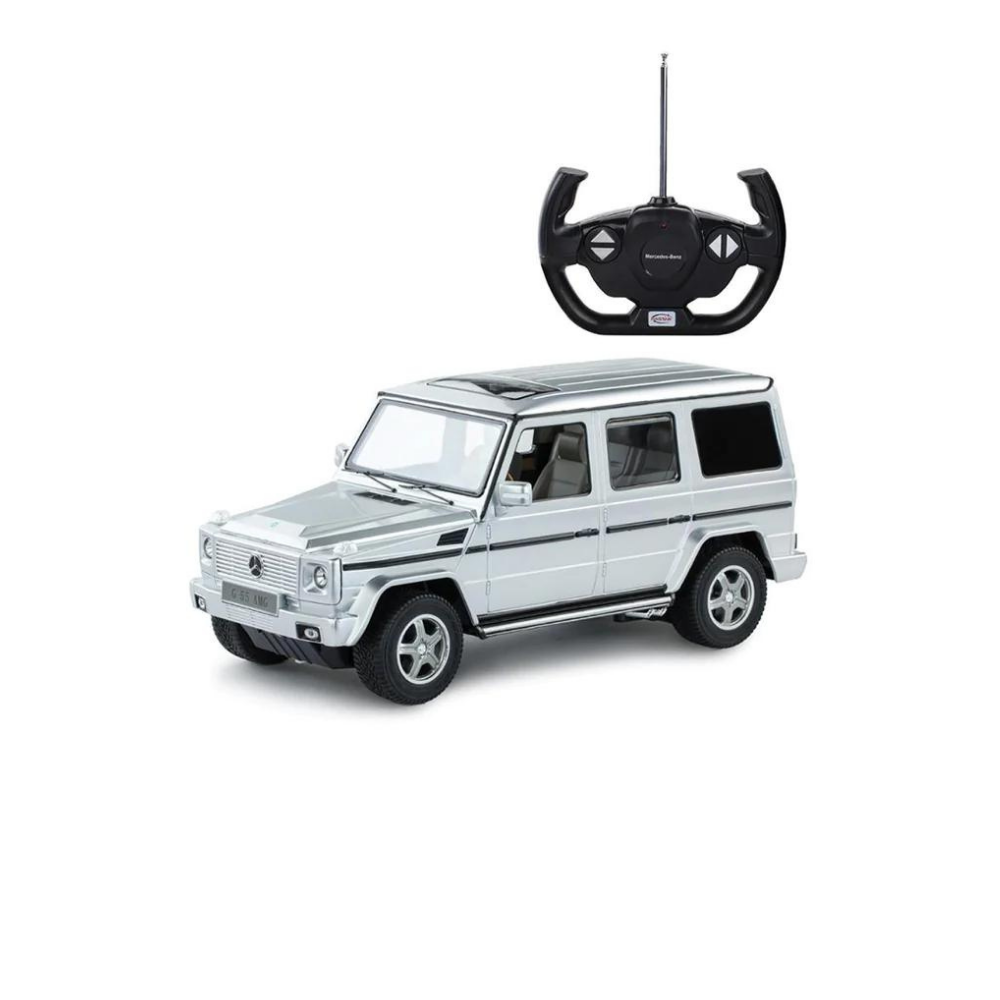 Voiture RC Mercedes‑Benz G55 AMG 1:14, en gris métallisé, télécommande 2,4 GHz, feux LED avant/arrière, suspension indépendante, pneus en caoutchouc. Vitesse jusqu’à 12 km/h, portée ~30 m, prête à l’emploi (5+2 piles AA), idéale dès 6 ans.