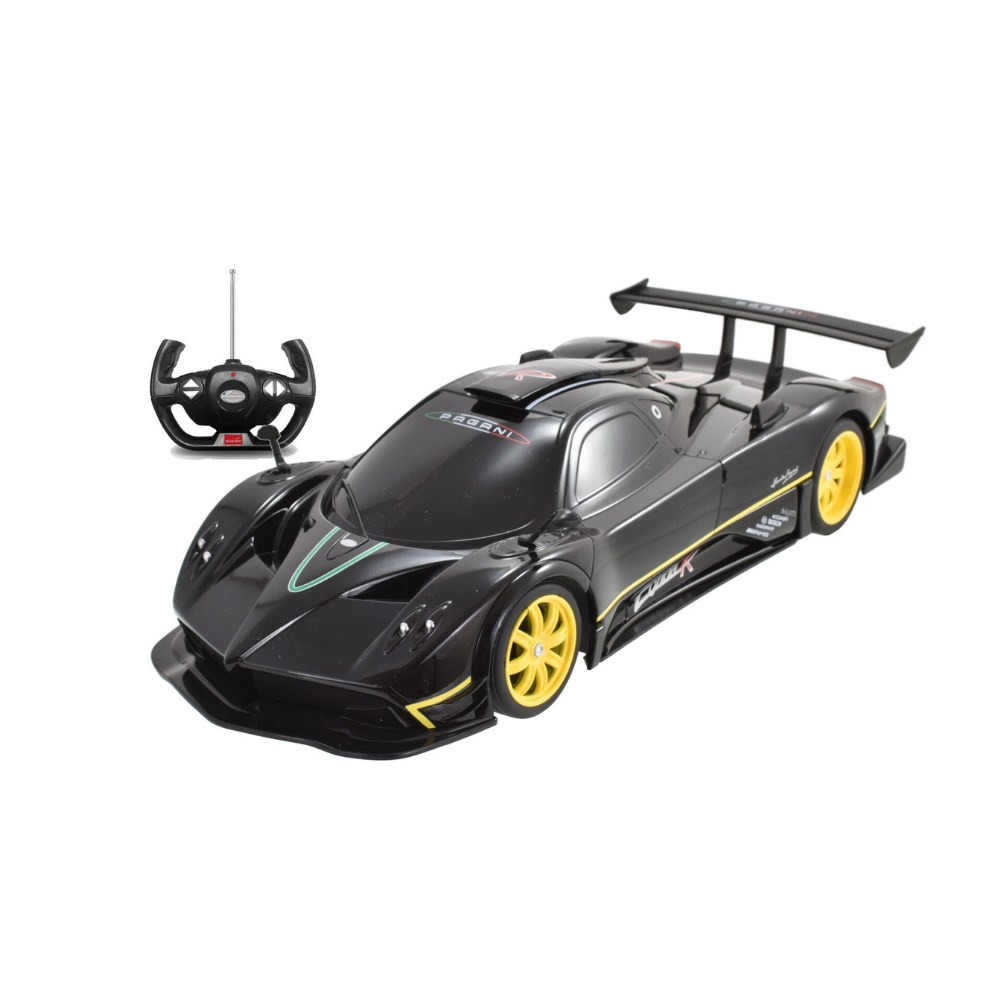 Voiture RC Pagani Zonda R noire 1:14, licence officielle, télécommande 40 MHz, phares LED avant/arrière, suspension indépendante, pneus caoutchouc. Vitesse environ 11 km/h, recommandée dès 6 ans.